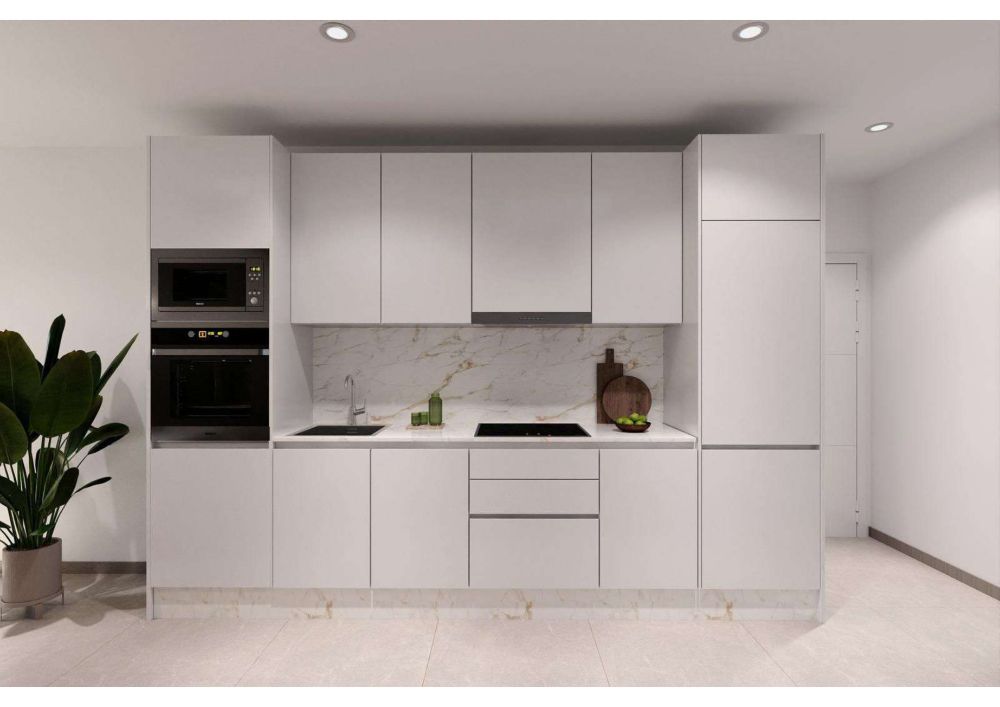 La cocina se entrega amueblada con muebles altos y bajos, acabados en estratificado y con encimera de resina tipo Silestone o similar.